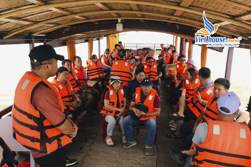 – Quý đoàn đến Mỹ Tho, đi thuyền trên sông Tiền. Lên thuyền xuôi dòng Tiền Giang ngắm nhìn các cồn: Lân, Long, Quy, Phụng. Tham quan và đi dọc đường làng: Dùng trái cây miền nhiệt đới, tham quan xưởng sản xuất kẹo dừa, thưởng thức mật ong được hút từ nhụy hoa sẵn có trong vườn, vừa thưởng thức đờn ca tài tử – một hình thức ca sướng đặc trưng của người miền Tây, xuôi mái chèo theo con lạch rợp bóng hàng dừa nước.