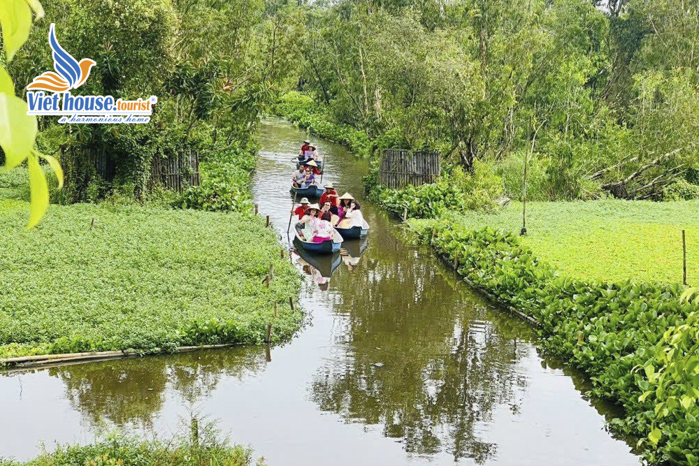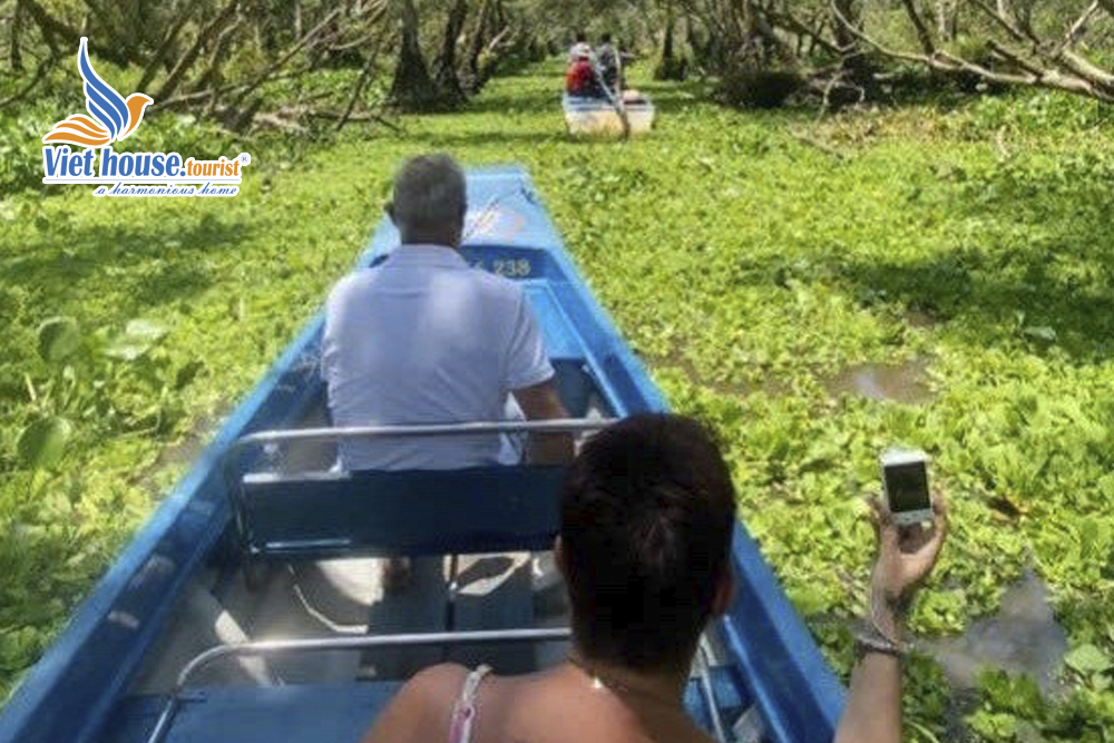 – Đến nơi, Quý đoàn sẽ trải nghiệm ngồi trên chiếc xuồng ba lá, xuôi mái chèo ngồi trên xuồng cùng với các cô nhân viên mặc bộ bà ba truyền thống cũng là hướng dẫn viên địa phương đưa quý khách len lõi trong những con rạch nhỏ xuyên rừng tràm rất yên bình và tĩnh lặng, tận hưởng khung cảnh chim trời cá nước mênh mông đan xen với thảm bèo cám phủ đầy mặt nước.